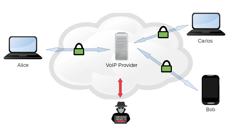 IP telephony services such as Skype, Hangouts, WhatsApp and others allow quick and cheap communications globally. While the benefits thereof are evident; there are also implications related to privacy. The aforementioned centralize the communications of billions of people. For example, Microsoft, in the case of Skype, or Google, in that of Hangouts, have full access to all communications that cross their servers, as can be seen in Image 1.